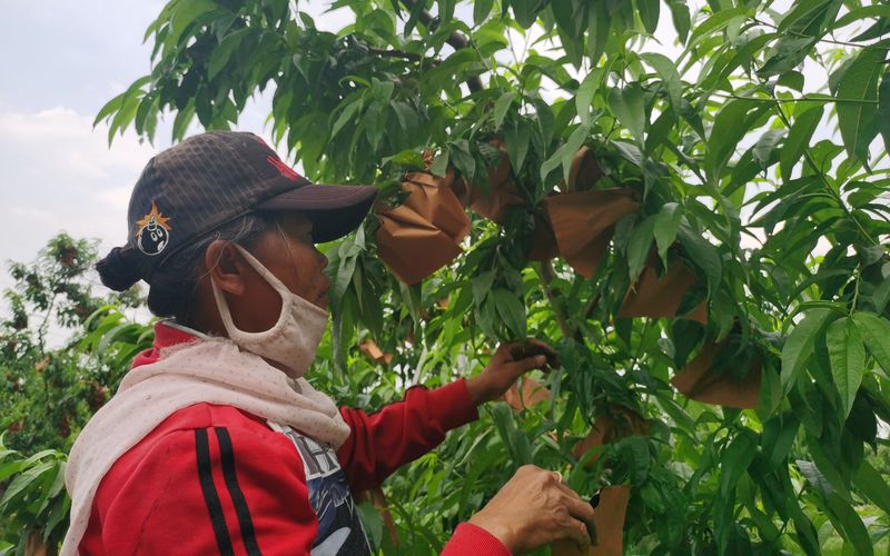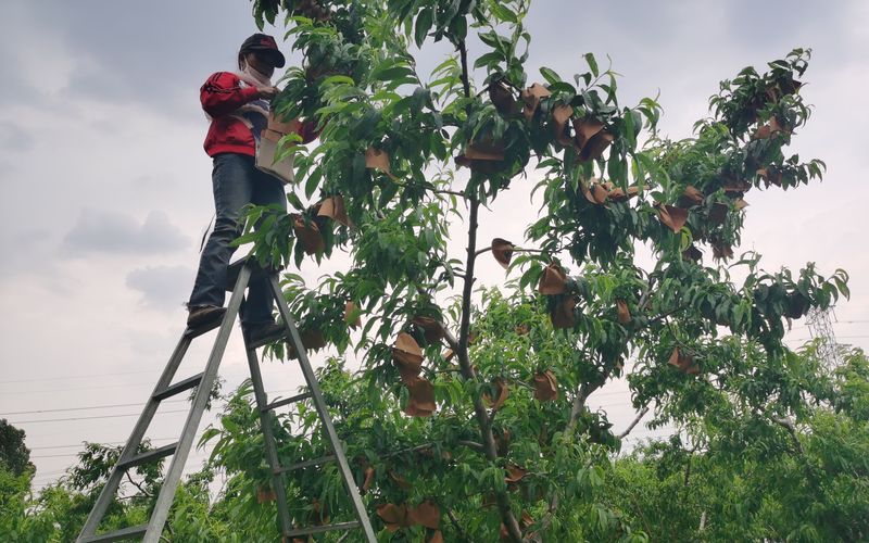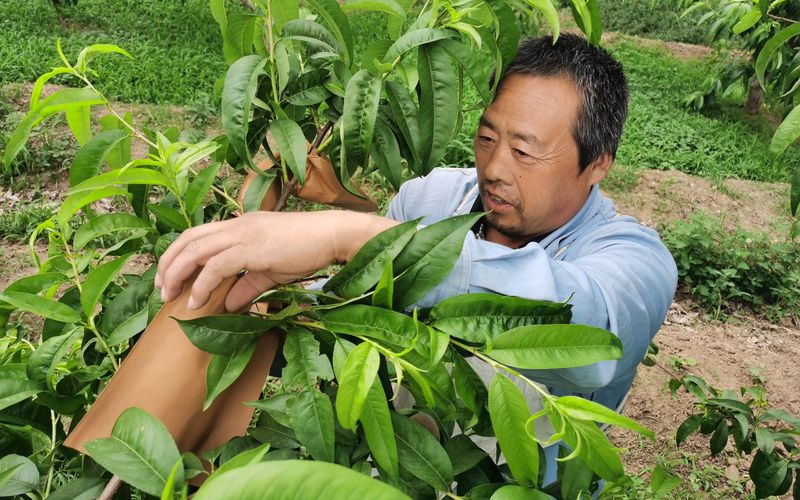 新京报讯(记者 周怀宗 王颖)站在桃树下,邢爱国穿着一个有兜的围裙,兜里装着一摞套水果的纸袋。他抽出一张,两手各持一角,顺着树上青绿色核桃大小的桃,往上一套,手一拧,一个袋就套好了。他的妻子站在梯子上,重复着同样的动作。一棵树几百个桃,他们两个人要套半个多小时。然而,邢爱国直言,这种劳动付出其实意义不大。对很多桃农来说,无袋栽培技术或许才是未来的方向。